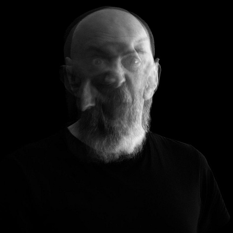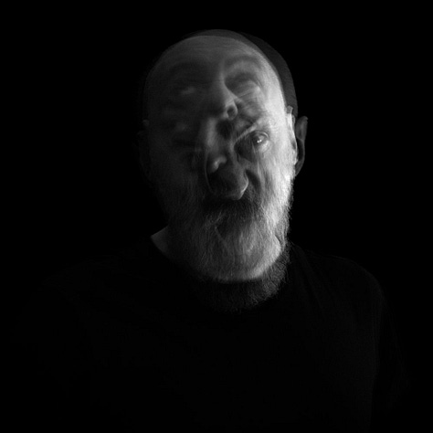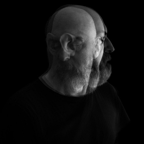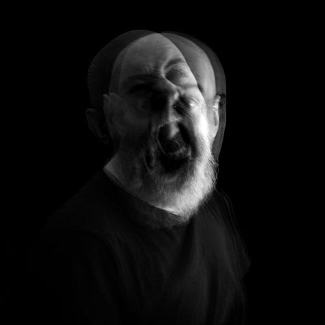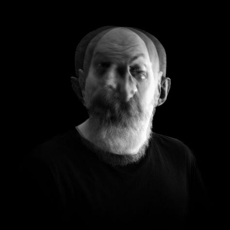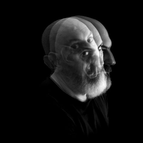 The blurred, overlapping faces suggest a fractured self, caught between different states of being, the tension between presence and absence, clarity and dissolution, expressing the raw, shifting nature of human existence.